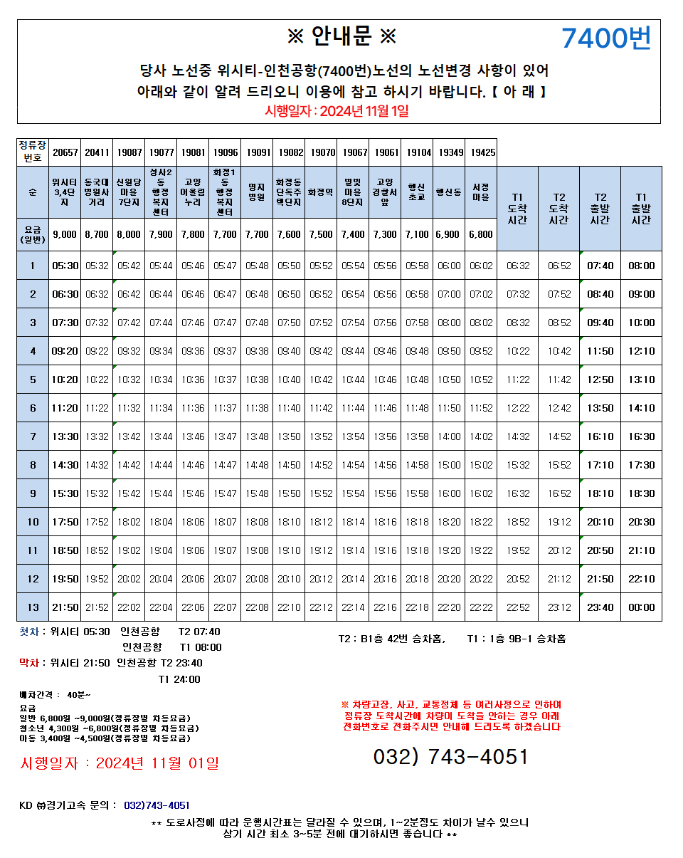 고양 위시티 인천공항 리무진 7400번 운행시간표